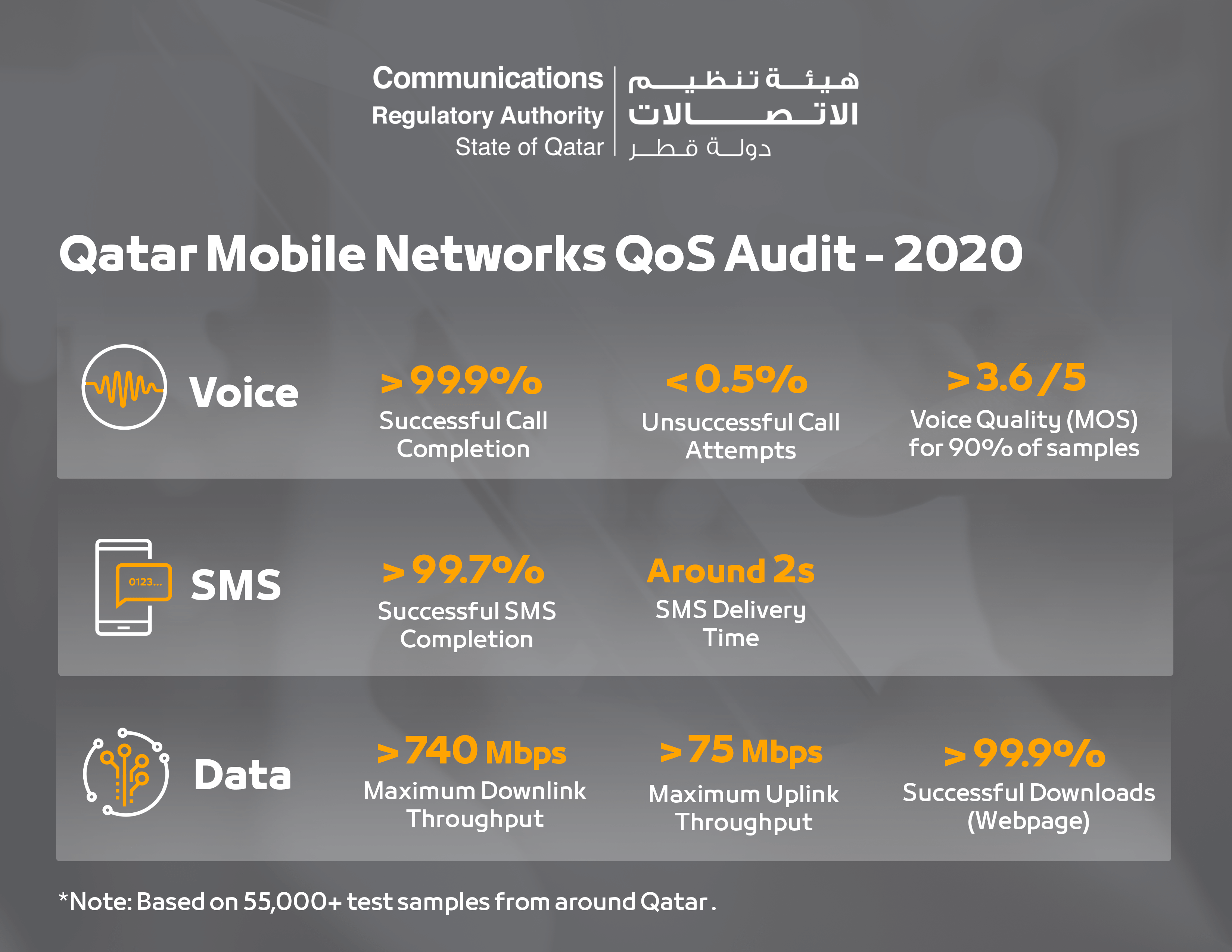 The Communications Regulatory Authority (CRA) published today on its website the summary results report of its extensive audit of mobile networks that was conducted from September to December 2020 to assess the improvements of the Quality of Service (QoS) levels offered by the telecom Service Providers in Qatar; Ooredoo Qatar Q.P.S.C. and Vodafone Qatar P.Q.S.C.